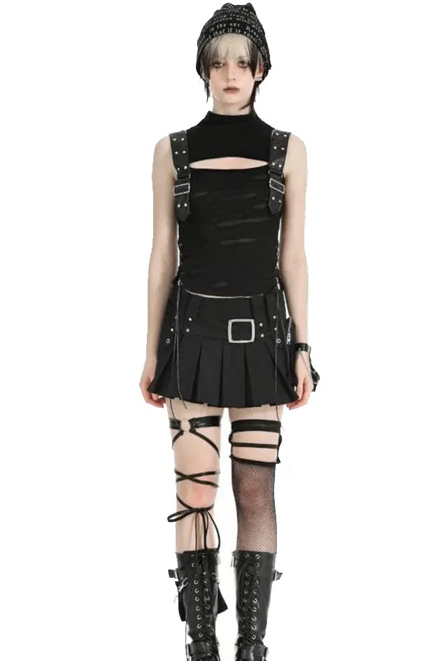 Punk Ripped Eyelet Irregular Slip Dress Black