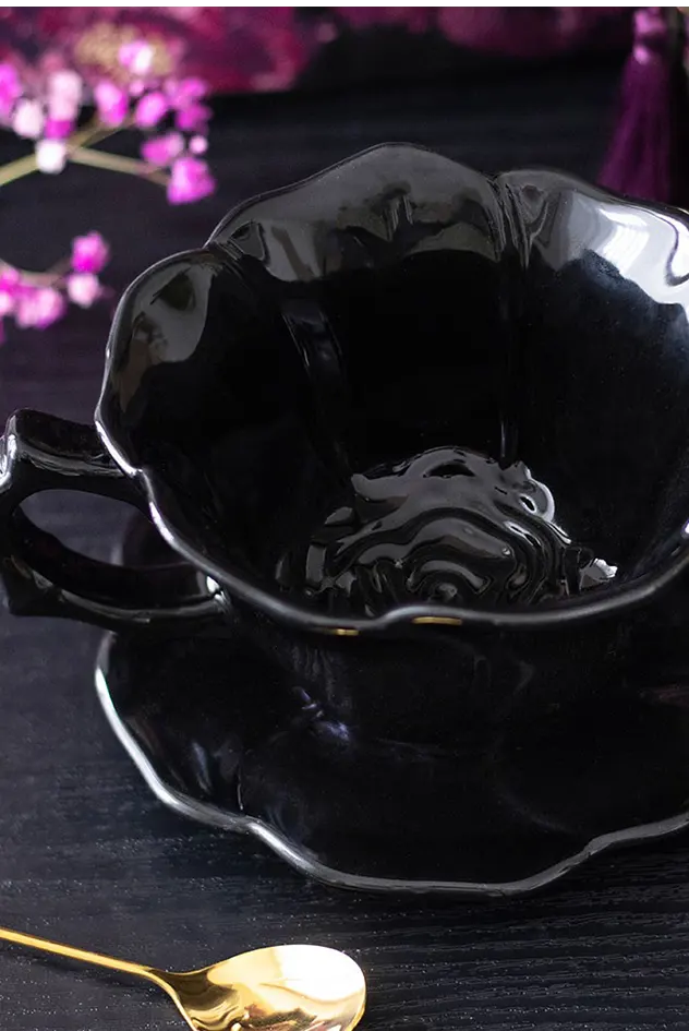 Summon timeless elegance with this black ceramic teacup and matching saucer, sculpted in the likeness of a dark, blooming rose. With its shadowy silhouette and delicate petal detailing, this piece adds a touch of gothic grace to every tea ritual. 250ml capacity.